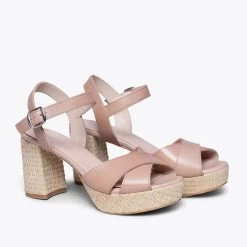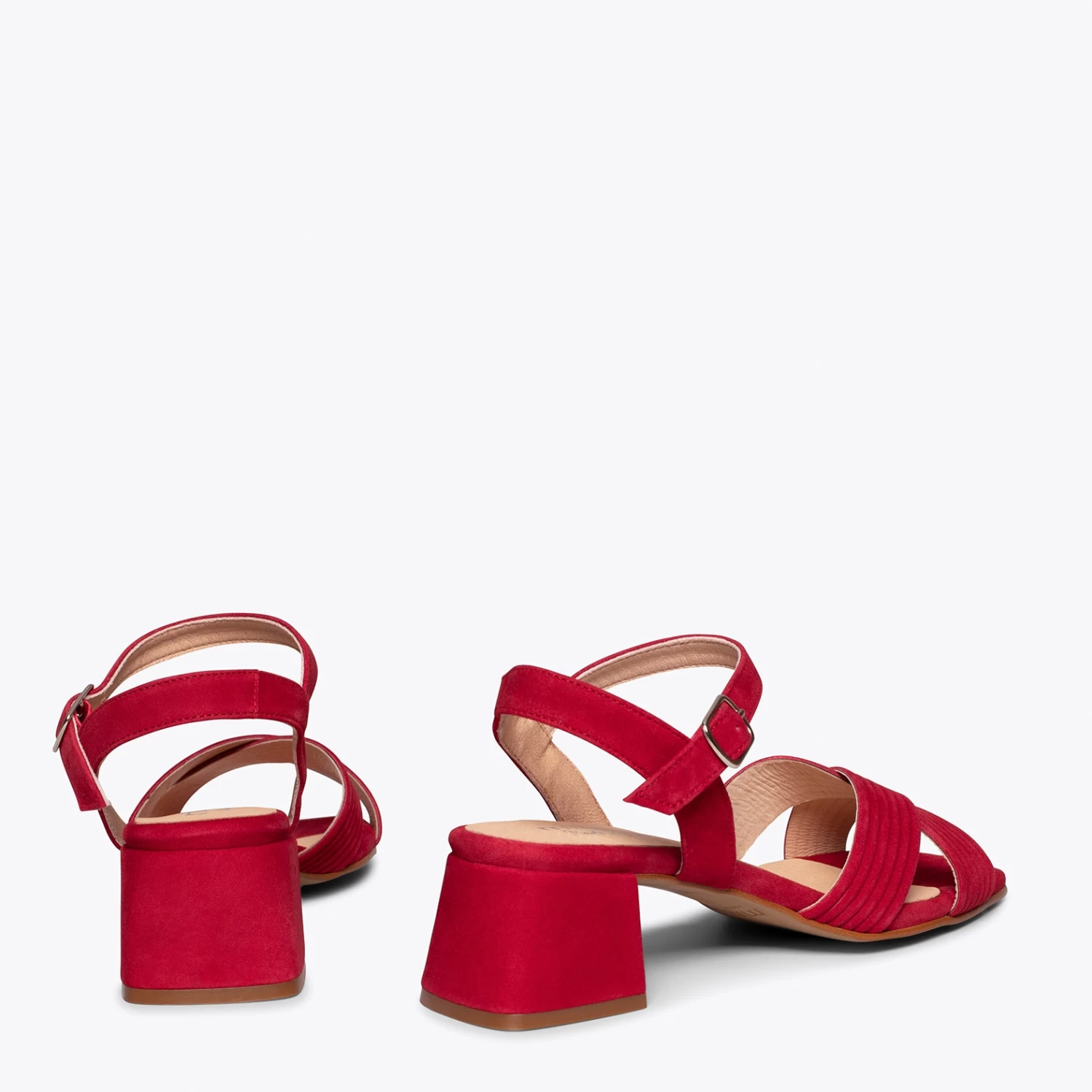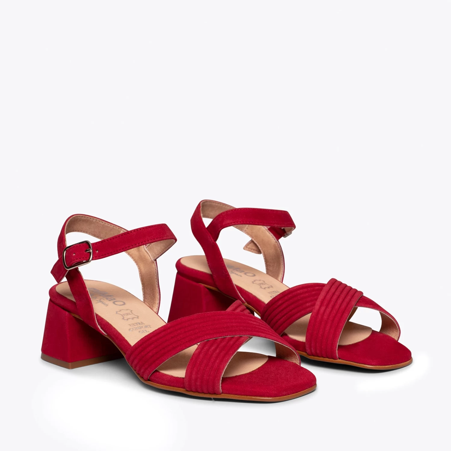 Sandales ROUGE élégantes en cuir daim, avec brides croisées et bout carré. Ce sont des sandales avec un talon moyen épais de 5 cm, une hauteur très abordable pour marcher pendant des heures. De plus, elle intègre la semelle intérieure en cuir Goutte Ultra Confort Gel, ce qui rend les talons confortables. Ces sandales pour femme sont fabriquées en Espagne. Choisissez la qualité d’une chaussure espagnole que vous pouvez acheter en ligne dans notre magasin de chaussures miMaO.