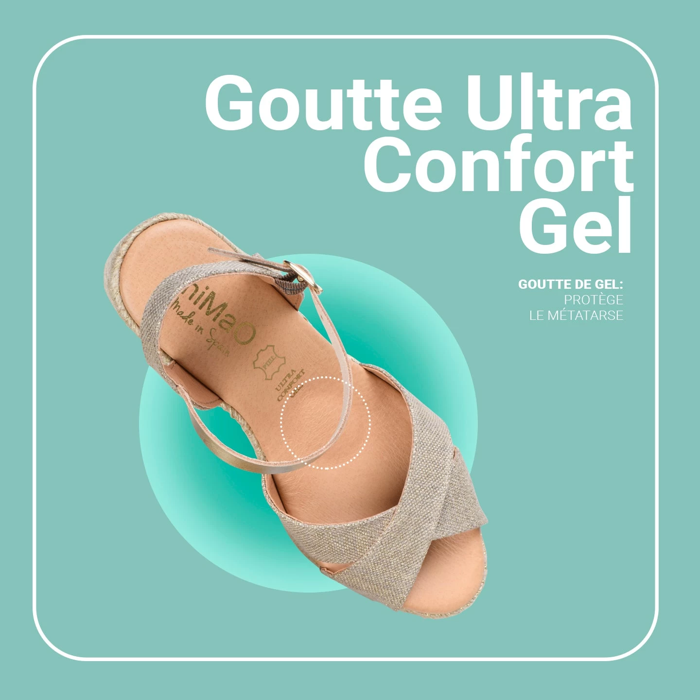 Elles sont dotées d’une semelle intérieure en cuir respirant avec technologie Ultra Confort Gel avec goutte, qui amortit l’impact de la marche et réduit les possibles gênes sur la voûte plantaire. La cambrure de cette espadrille compensée est étudiée par nos designers pour pouvoir les porter pendant de longues heures sans douleur. Le bracelet à la cheville est doté d’une jolie boucle dorée qui permet de l’ajuster à la cheville et offrir un bon soutien.