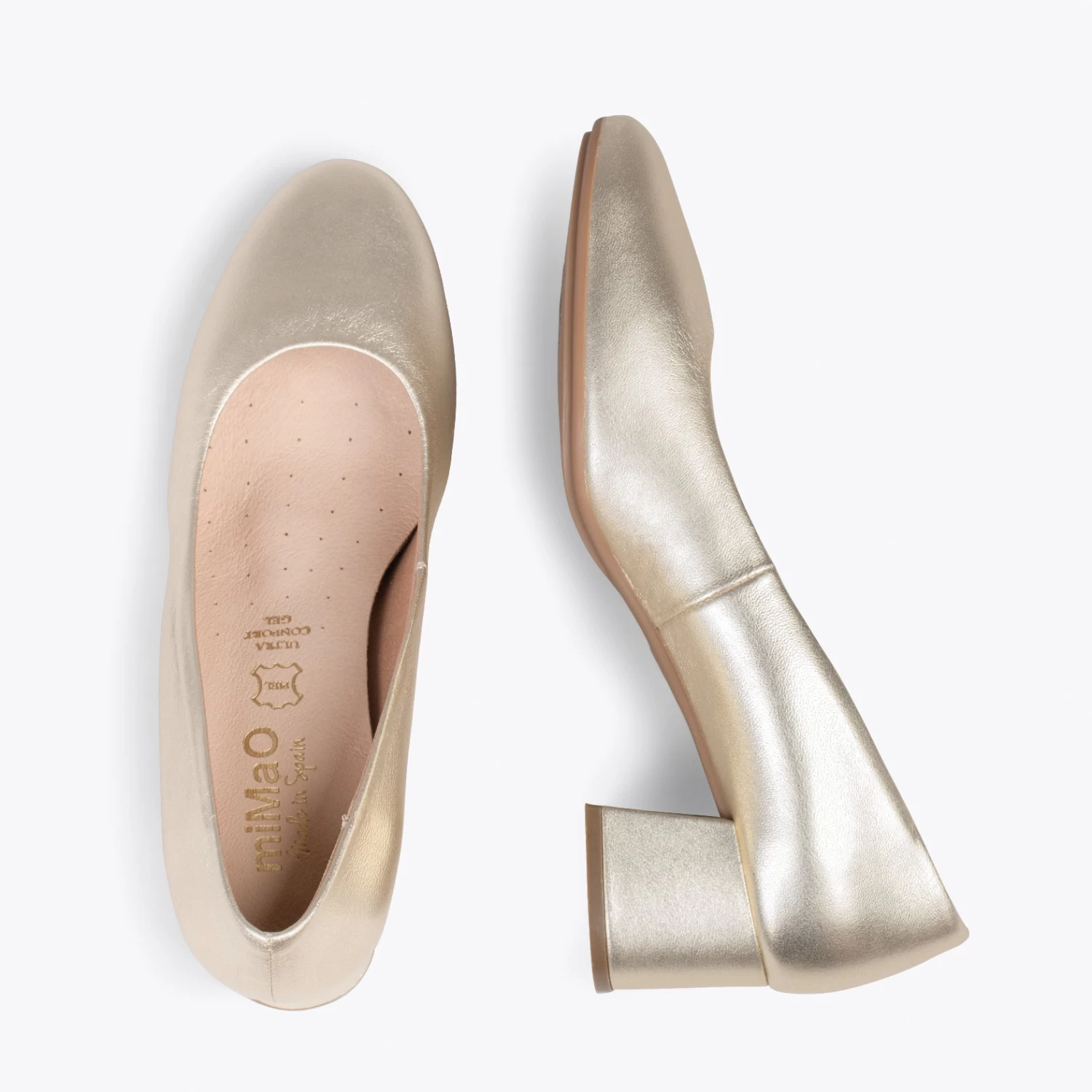 Talon bas et large avec légère forme de trapèze, conçu pour accourcir l’espace entre la cambrure et le talon et augmenter ainsi le confort. La semelle de ces chaussures intègre la technologie Ultra Confort Gel pour absorber l’impact de la marche sur le métatarse.